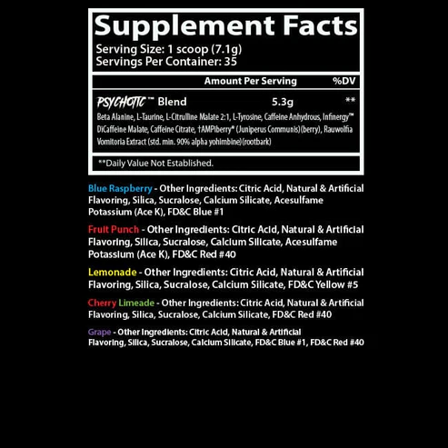 • LA MANO DERECHA DE LA PERDICIÓN – Cuando Hellboy va al gimnasio, por supuesto, usa a Psychotic Hellboy. ¿Cómo crees que derrota a Baba Yaga? Con una dosis completa de beta-alanina para aumentar la resistencia muscular, malato de citrulina para aumentar los niveles de óxido nítrico y lograr un bombeo venoso explosivo, e Infinergy para aumentar los niveles de energía y estimular la termogénesis. Por último, pero no menos importante, AMPiberry patentado por Insane Labz para suavizar y absorber hasta el último ingrediente.